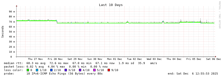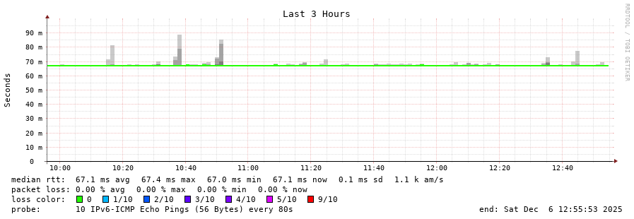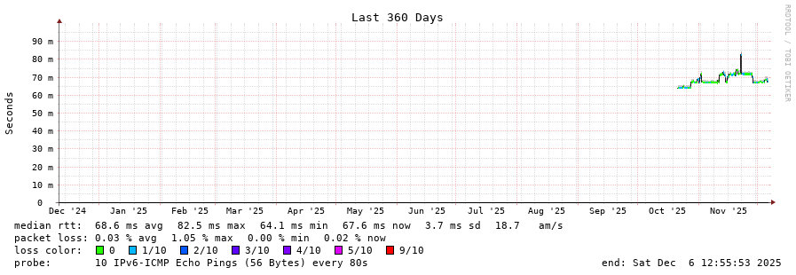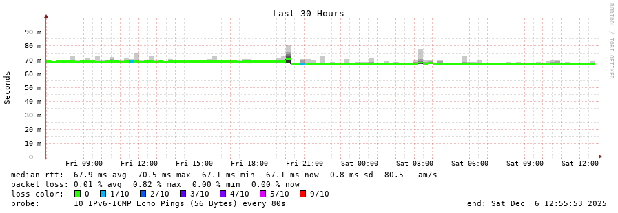 traceroute to 2001:67c:1e0:0:c225:e9ff:fea8:6a0a (2001:67c:1e0:0:c225:e9ff:fea8:6a0a), 30 hops max, 80 byte packets - Generated at 2025-12-06 12:45:01