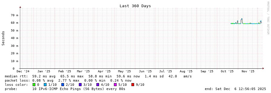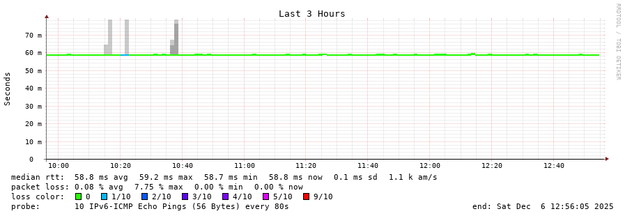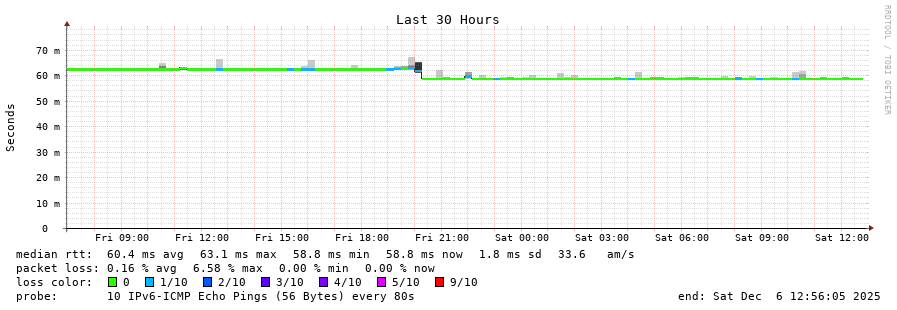 traceroute to 2a00:c30:bbbb:d::2 (2a00:c30:bbbb:d::2), 30 hops max, 80 byte packets - Generated at 2025-12-06 12:45:01